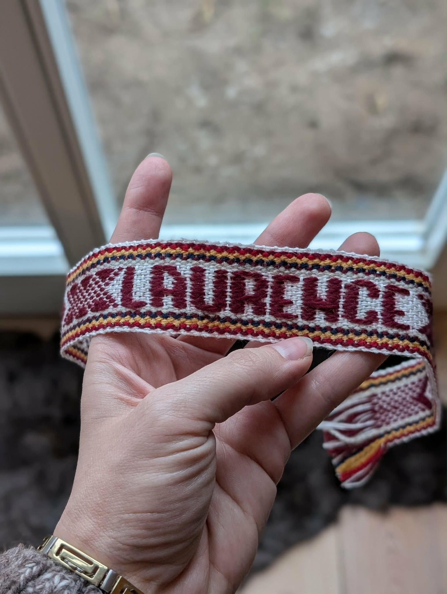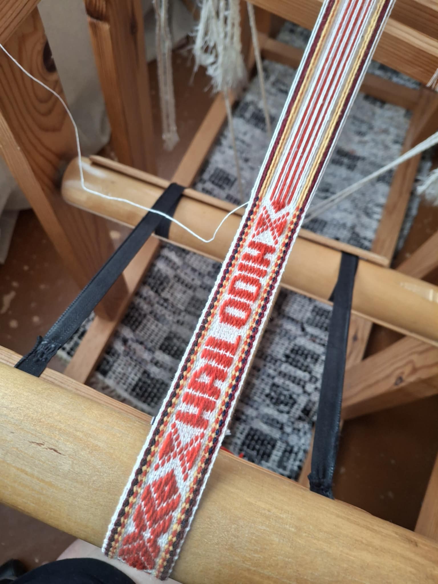 Inspired by traditional Latvian and historical symbols, this work continues a family weaving tradition. Fifteen years ago, wooden looms were built by hand so weaving could continue from home – a practice that remains central to the craft today.