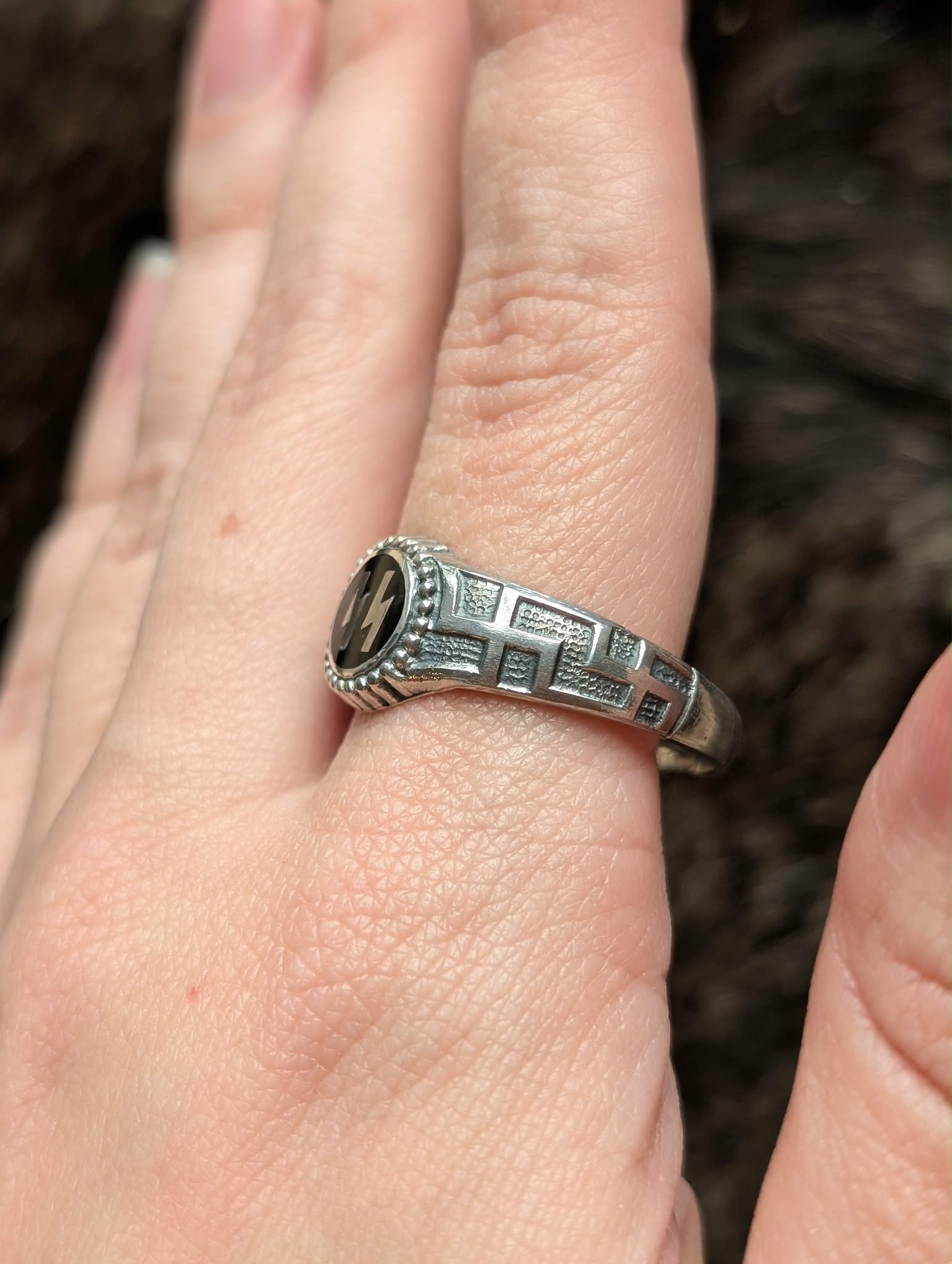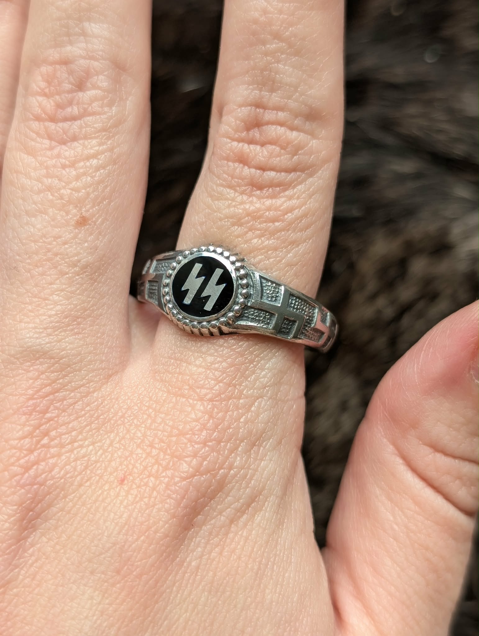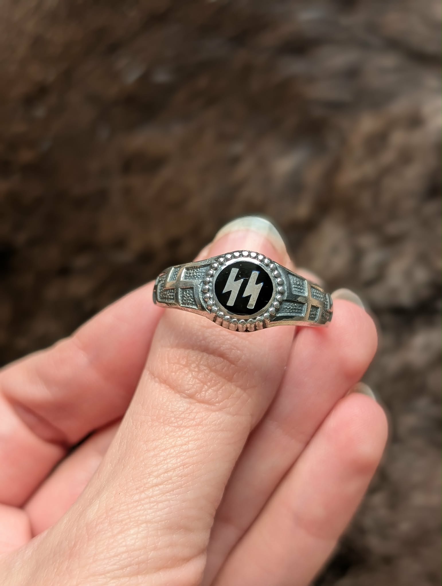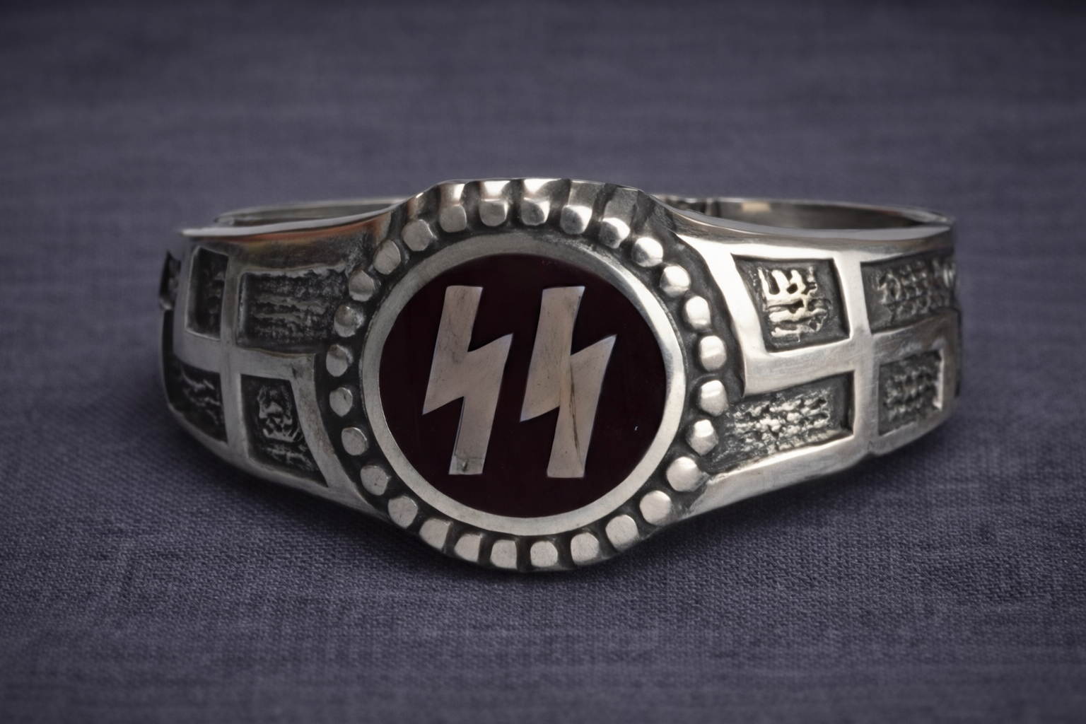 The sides feature stylized swastika motifs integrated into the band, while the top displays the SS symbol in contrasting enamel. The design focuses on clean geometry, traditional craftsmanship, and historically inspired metalwork.