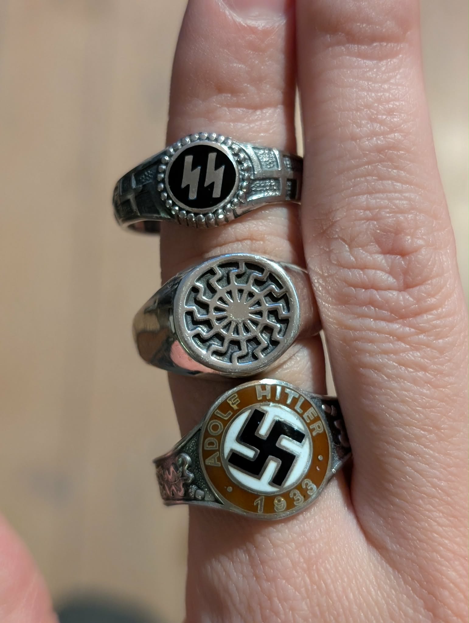 The ring is handmade from solid sterling silver and finished with real hot enamel- black enamel with light SS symbols.
